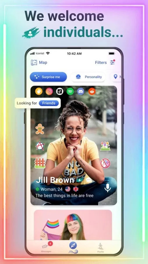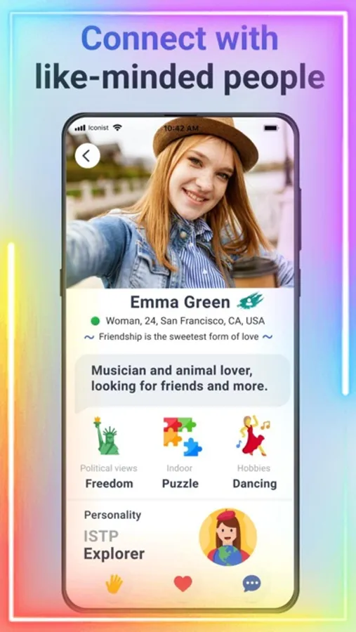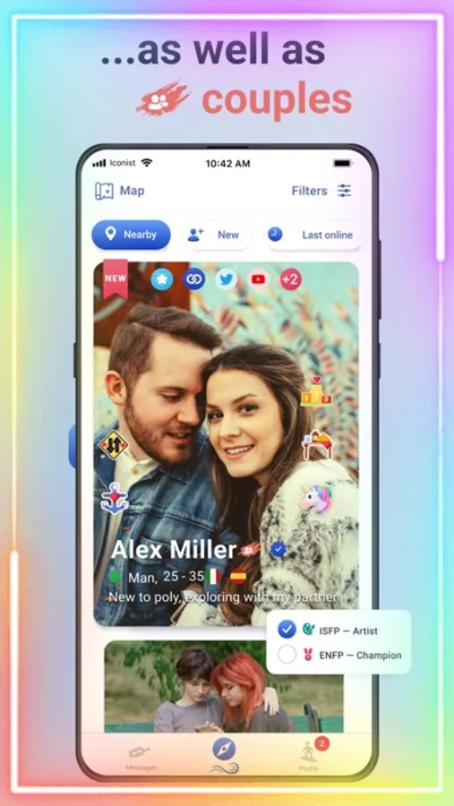 Iconist is designed as an alternative polyamorous dating app where you can express yourself with an eye-catching, detail-rich profile to find people locally or form long distance relationships.