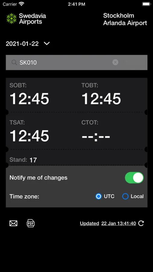 In this app, you will find all planned departures from Stockholm- Arlanda for the next xx hours. Insert the ICAO callsign or IATA flight number and all the latest A-CDM related information will be available via push notifications, if this option is selected in the app.