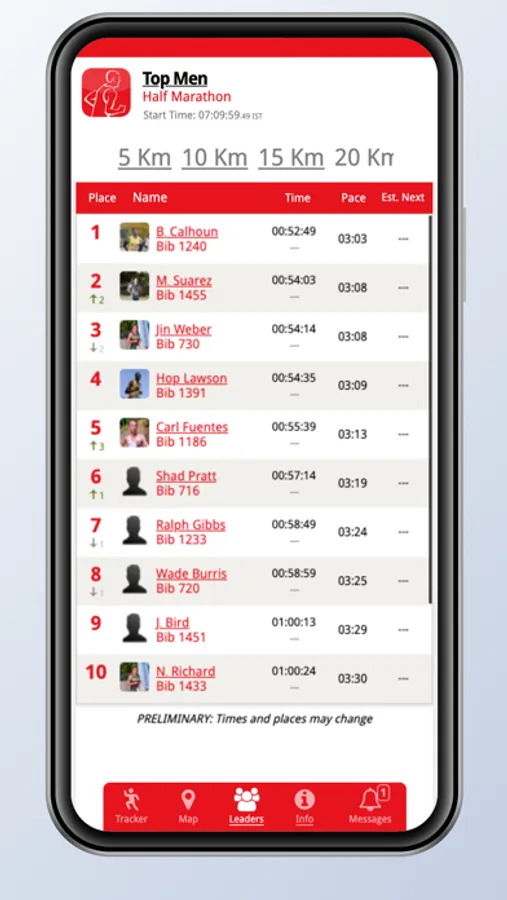 • Participant times, paces, estimates, and places in real-time