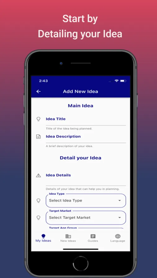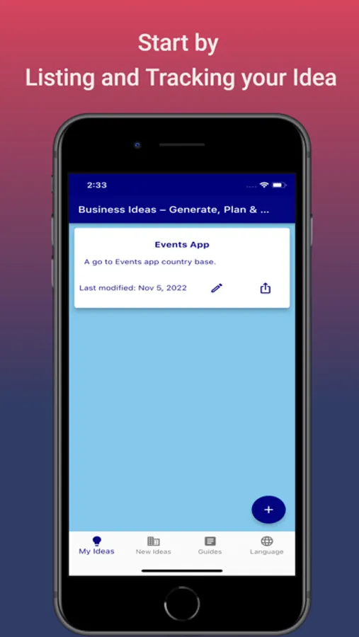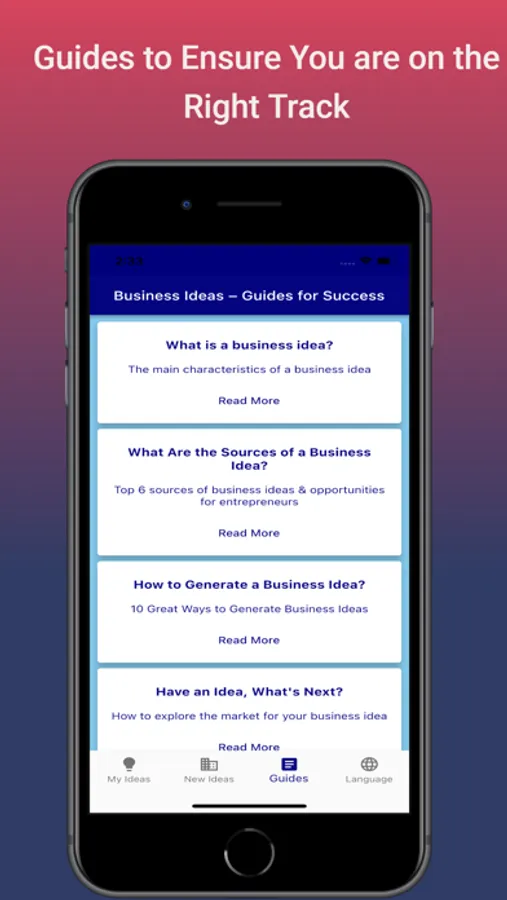 The App has a list of ready ideas which you can benefit from. The list is well maintained and gets updated frequently by our support team. You can even share those ideas with your family and friends in a very easy way. You can always find the newest ideas in the market that would enable you to start your own business. The ideas are cherry picked and covers various business related areas.