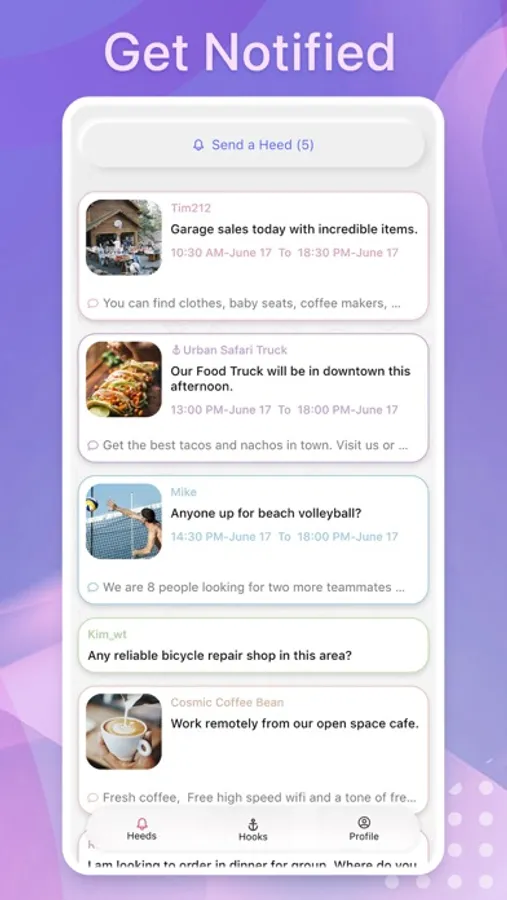 As a business you can send notifications about your offers, specials, new menu items, events, etc. to your potential customers. Heedhook aims to support local communities whether it’s by Buying, selling, or swiping used items or renting out your apartment and finding roommates. You can also use the app shop from local businesses, throwing successful garage sales, volunteering for events or helping people find playmates for sport.