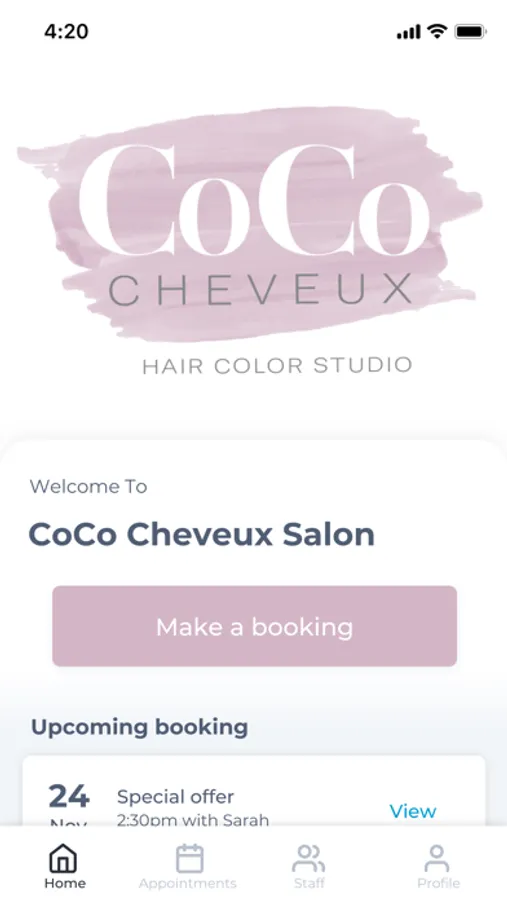 The CoCo Cheveux Salon app makes booking your appointments and managing your loyalty points even easier. You're just a few taps away from feeling good and looking great!