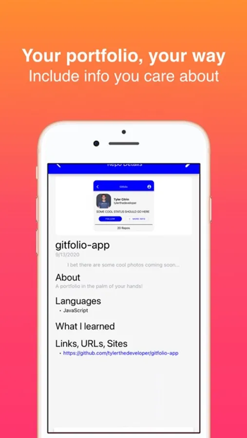 Welcome to Gitfolio, the app you need to showcase yourself and your personal projects from Github. Don't rely on a Readme, use Gitfolio to add a personal touch to your repos and projects.