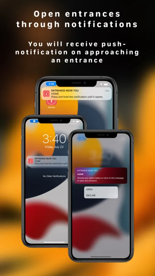 • you will receive push-notifications on approaching an entrance. Click or long press on a notification will allow to open an entrance.