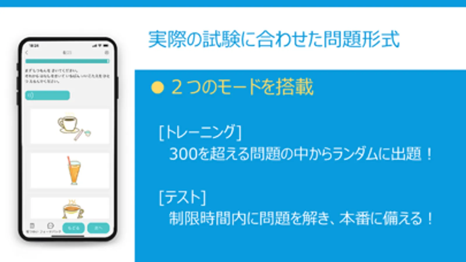 たくさん問題を解くトレーニングモードと、実際の試験を想定したテストモードの2種類があり、段階的に学習することができます。