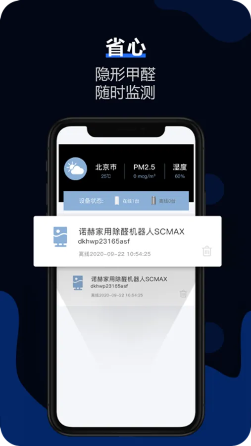 诺赫app是你家里的智能净化管理平台,通过诺赫app,你可以完成手机与智能家用除醛机器人之间便捷快速的交互,获取家庭空气质量等资讯。