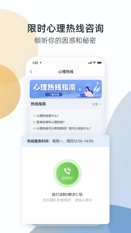 免费热线是杏仁盒平台为用户提供的一种语音的、免费的、即时的心理咨询福利。本质仍是心理咨询,用户可以在每周三、周日的晚上拨打免费热线获得心理支持和帮助。