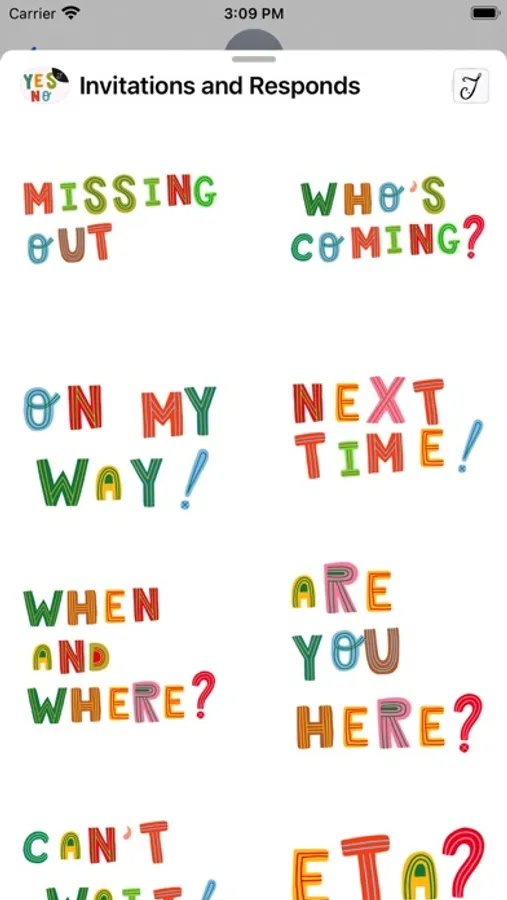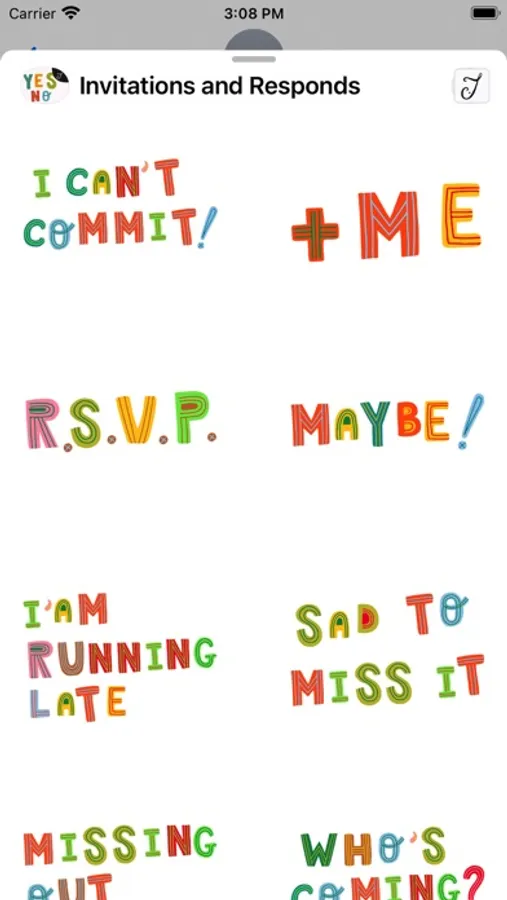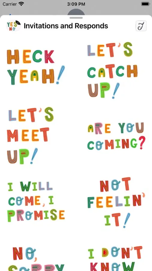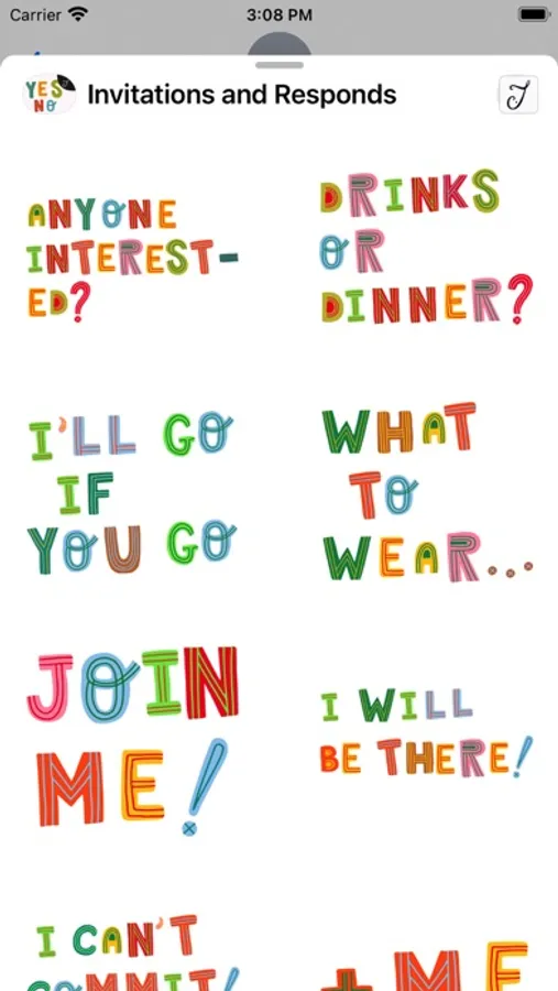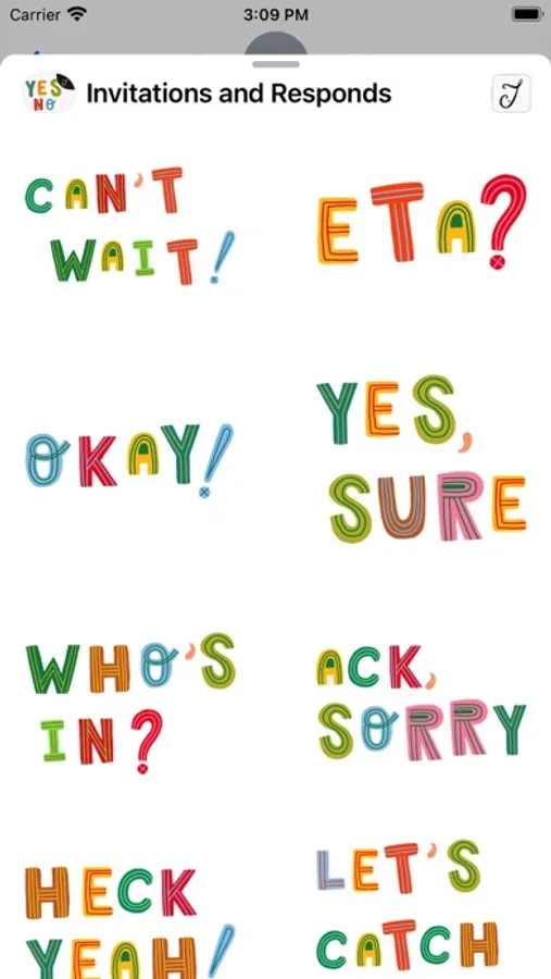 Make your text message more personal today, add some style to the technology you are using with this iMessage Stickers pack that comes with fun and bright lettering style messages. This iMessage stickers pack comes with the daily commonly used text messages to invite and responds to an invitation or offer.