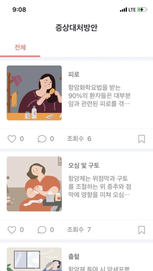 또한, 항암치료 후 생기는 부작용 증상에 대한 대처방안을 쉽게 찾아볼 수 있도록 구성하였습니다. 필요 시에 빠르게 도움을 받을 수 있어요!