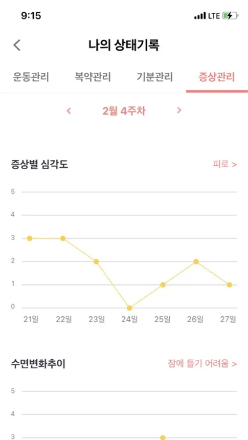 간단하고 편리하게 매일의 증상, 복약 체크, 걸음 수, 운동 시간, 기분 점수 등을 기록하고, 기록에 따라 제공해 드리는 각각의 그래프를 통해 자신의 상태 변화를 파악하고 의료진에게 나의 상태를 쉽게 전달해보세요!
