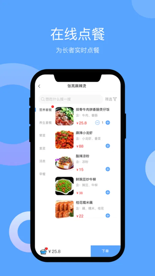7、支持在线点餐,帮助长者点餐,可根据口味、口感、禁忌人群等条件筛选。