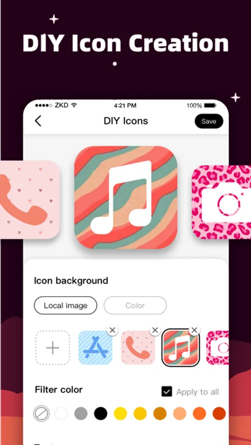 DIY icon feature: MyICON provides a great variety of icon creation tools. You can create unique icon packs by selecting local images, choosing colors and filters, adding patterns and text, and set the icons that you created as home screen icons. Create a unique home screen now!