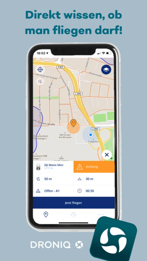 Sicher und schnell erfahren, wo und wie Drohnenpiloten ihre Drohne fliegen dürfen. Diese Fragen beantwortet ab sofort die Drohnen-App der DRONIQ GmbH. Ziel der DRONIQ, einem Joint Venture der Deutschen Flugsicherung (DFS) und der Deutschen Telekom ist die sichere und faire Integration von Drohnen in den Luftraum.