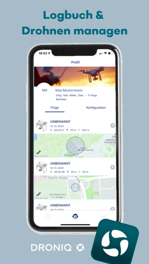 Neben luftraumrelevanten Daten zeigt interaktives Kartenmaterial die typische Infrastruktur, wie Krankenhäuser, Polizeistationen usw. an und warnt den Nutzer, wenn seine Distanz hierzu zu gering ist. Weitere Karteninformationen können benutzerdefiniert ein- und ausgeblendet werden. In der Logbuch-Funktion werden bereits durchgeführte Flüge übersichtlich dargestellt und können nachträglich bewertet und mit Details versehen werden. Weiterhin kann der Nutzer sein Profil anpassen und Drohnen hinzufügen bzw. bearbeiten.