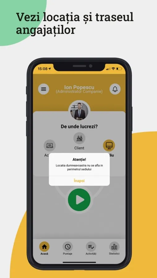 geofencing - recunoașterea locației de la care se face start-ul și stop-ul pontajului,