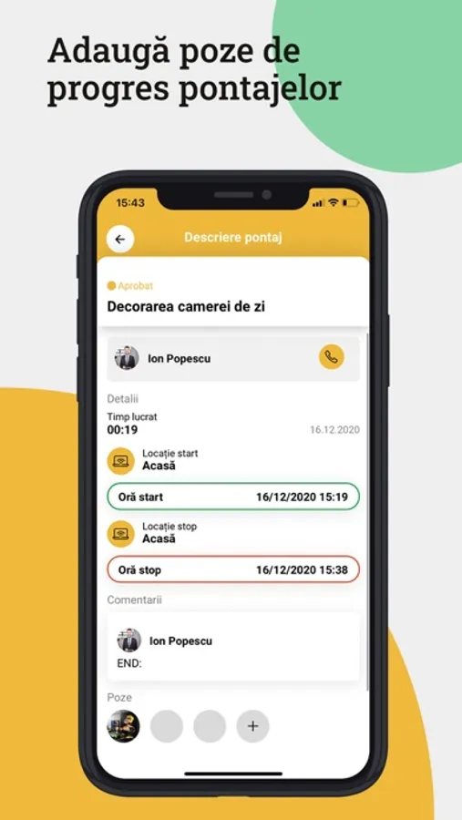 adăugare de poze și asocierea acestora cu activitățile, pentru a tine evidența vizuală a progresului muncii;