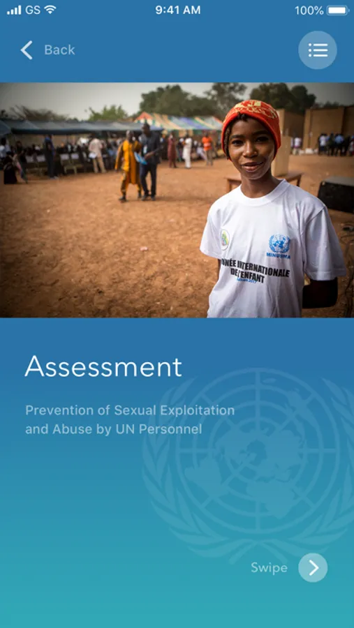 Mandatory online training on the prevention of sexual exploitation and abuse for UN staff and related personnel and accessible to the greater public. Certification provided at the end of the assessment.