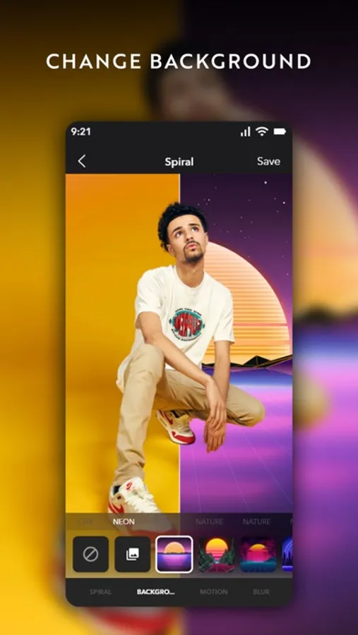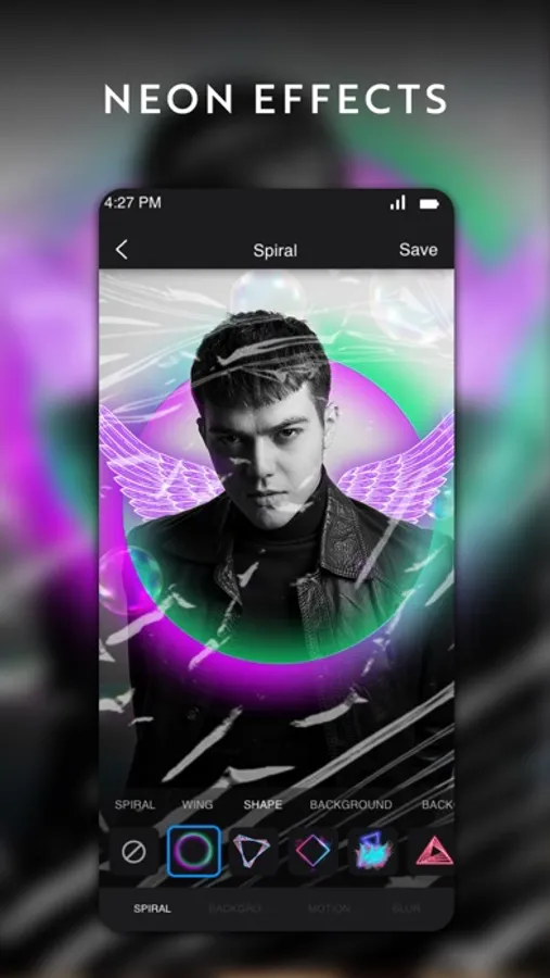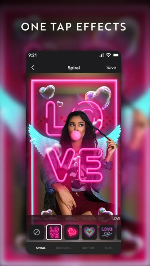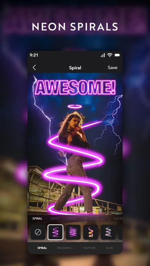 Surprising AI spiral editor has a vast amount of neon spiral options. Emoji backgrounds and colorful picture frames are here for you to create marvelous pictures. Combine neon effects and retro filter with neon picture frame collections to edit picture in style. Use motion effect and fx effect to create 3d photo looks.