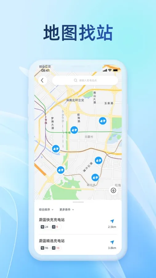 1. 智能推荐附近最近的充电站点,支持地图找站,支持一键导航;