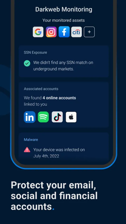 > Dark web monitoring for your breached passwords and personal information, keeping you informed if your information is compromised.