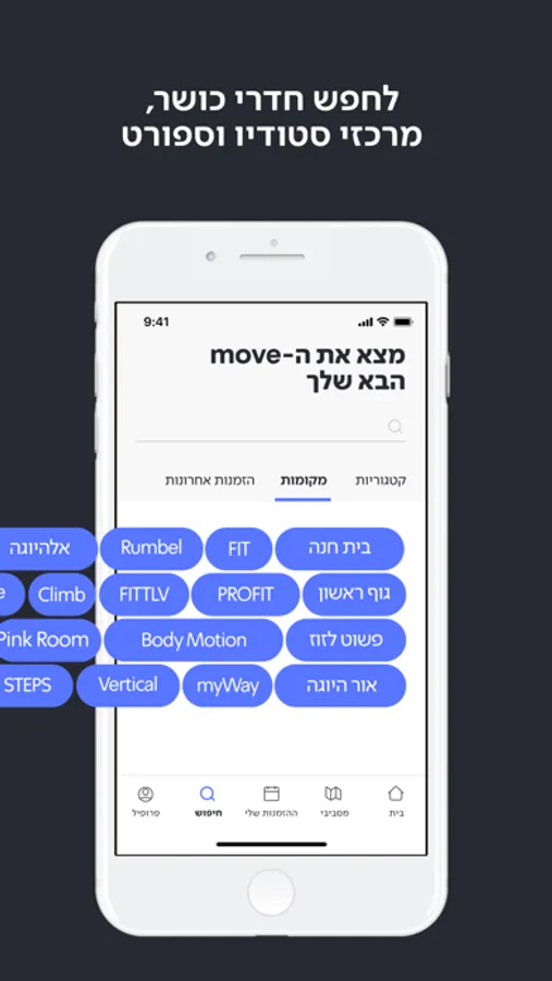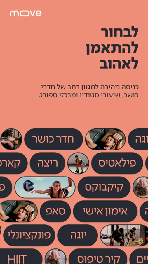 בברוכים הבאים ל- move (מוב), אפליקציית כושר חדשנית המאפשרת לכם לבחור מה שמתאים לכם מתוך אינסוף פעילויות כושר, ספורט ו-wellness בפריסה ארצית והכל במנוי אחד. מעכשיו אתם בוחרים את השיעורים שהכי מתאימים לכם, בזמן שנוח לכם ובמיקום שנוח לכם כי במנוי אחד לאפליקציה תוכלו להיכנס ליותר מ 800 מרכזי ספורט, סטודיו וכושר בתמהיל רחב הכולל חדרי כושר גדולים, סטודיו שכונתי וקטן לפילאטיס, אימון פונקציונאלי קשוח או משחק טניס בקאנטרי ועוד מגוון פעילויות עצום ומפתיע בפריסה ארצית קרוב לבית או לעבודה.