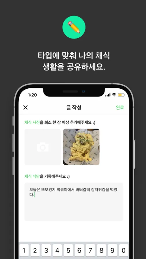 오늘 하루 나의 채식 식단을 최소 1장에서 최대 3장의 사진과 함께 기록하고 공유해보세요.