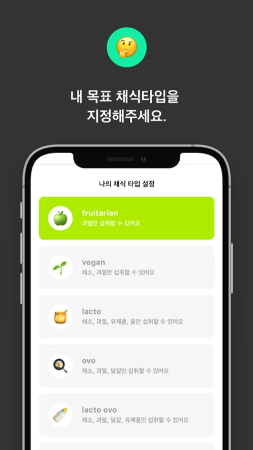 프루테리언, 비건, 락토, 오보, 락토 오보, 페스코, 폴로, 플렉시테리언 총 8가지의 채식 타입 중 나에게 해당하는 채식 타입을 설정해보세요.