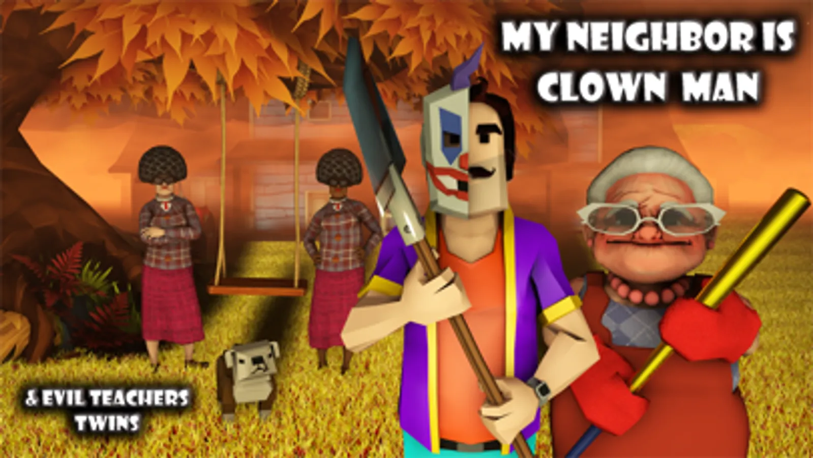 After a while, your grandma told you that your friends were missing. You decided to walk around the territory on your own, explore the territory and look for your friends. It was evening and you went to your neighbor's house. Scary screams came from his house and you saw a scary clown and granny in the window! You decided to run away and tell your grandparents about it, but your grandma didn't believe you.
