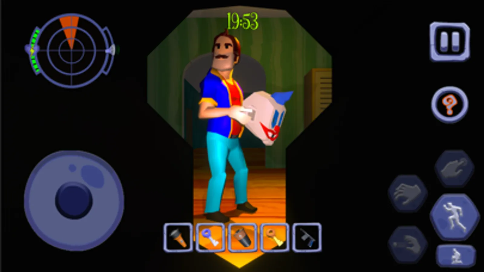 • Dynamic change of night, day and weather. At night, your neighbour puts on a scary clown mask and starts doing his terrible secret deeds. Sleep in your house to skip the night. Find a flashlight to see in the night!