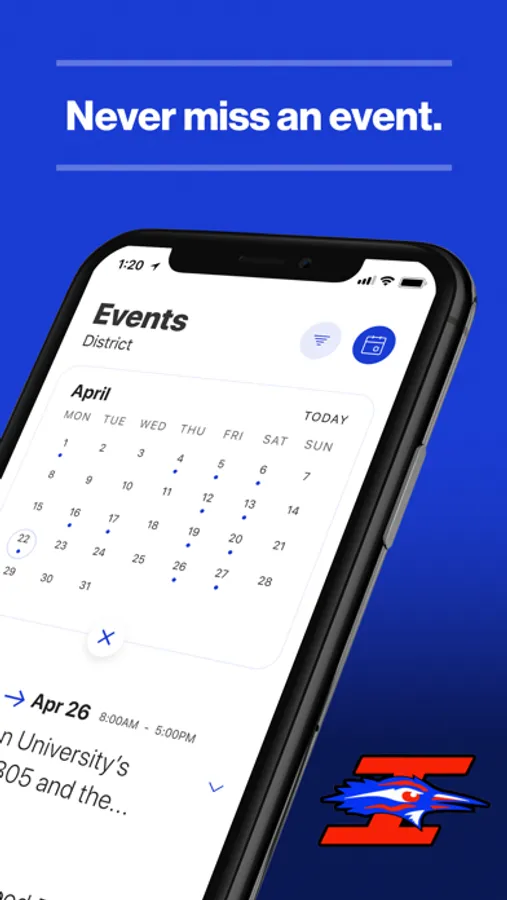 The event section shows a list of events throughout the district. Users can add an event to your calendar to share the event with friends and family with one tap.