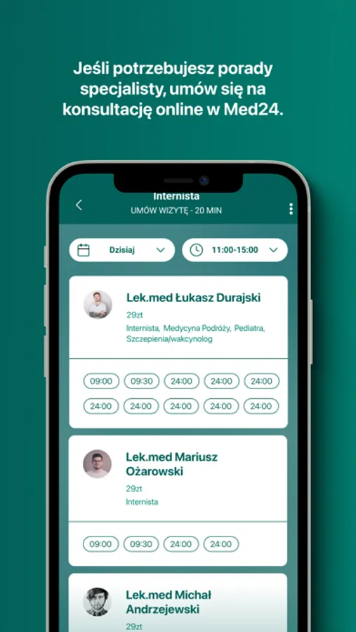 Korzystając z mobilnej aplikacji medycznej, możesz liczyć na profesjonalną poradę lekarską online zawsze wtedy, gdy tego potrzebujesz, bez długiego oczekiwania na termin wizyty. W Med24 masz ogromny wybór lekarzy różnych specjalności. Jeżeli potrzebujesz pilnej pomocy w nagłej sytuacji, wybierz specjalistę, który udostępnia najdogodniejszy dla Ciebie termin konsultacji medycznej online.