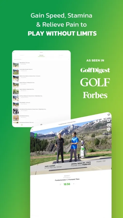 GOLFFOREVER is the #1 SMART at-home golf training app - used by multiple top 40 PGA and LPGA pros including 2022 Masters winner Scottie Scheffler -to maximize clubhead speed, core strength, flexibility, and range of motion through our proprietary, personalized golf-exercise plan. Designed by top tour trainers and doctors to improve your body, relieve pain and avoid injuries with golf-focused fitness, GOLFFOREVER is a top-rated app that gives members lower scores and pain-free living on and off the golf course.