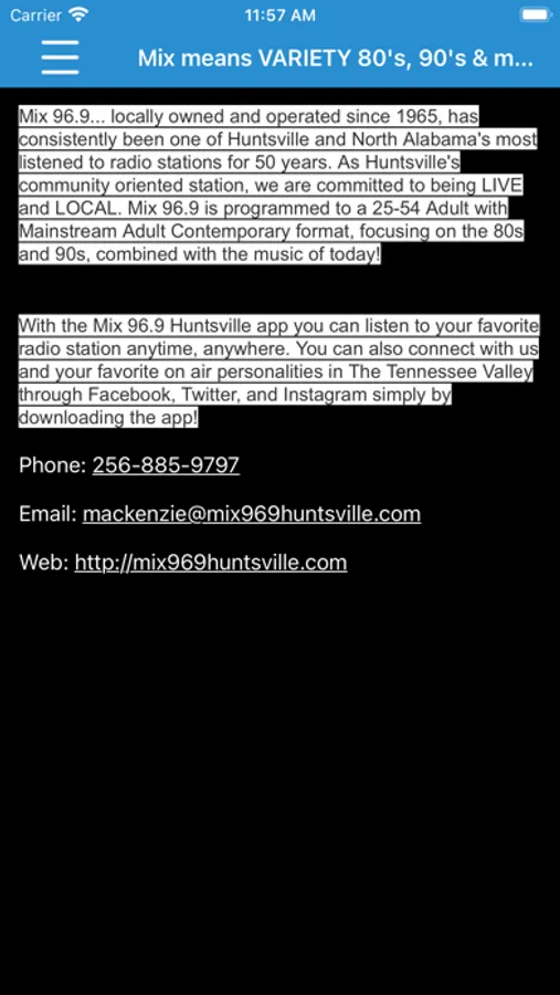 With the Mix 96.9 Huntsville app you can listen to your favorite radio station anytime, anywhere. You can also connect with us and your favorite on air personalities in The Tennessee Valley through Facebook, Twitter, and Instagram simply by downloading the app!