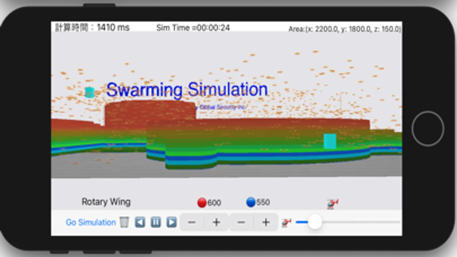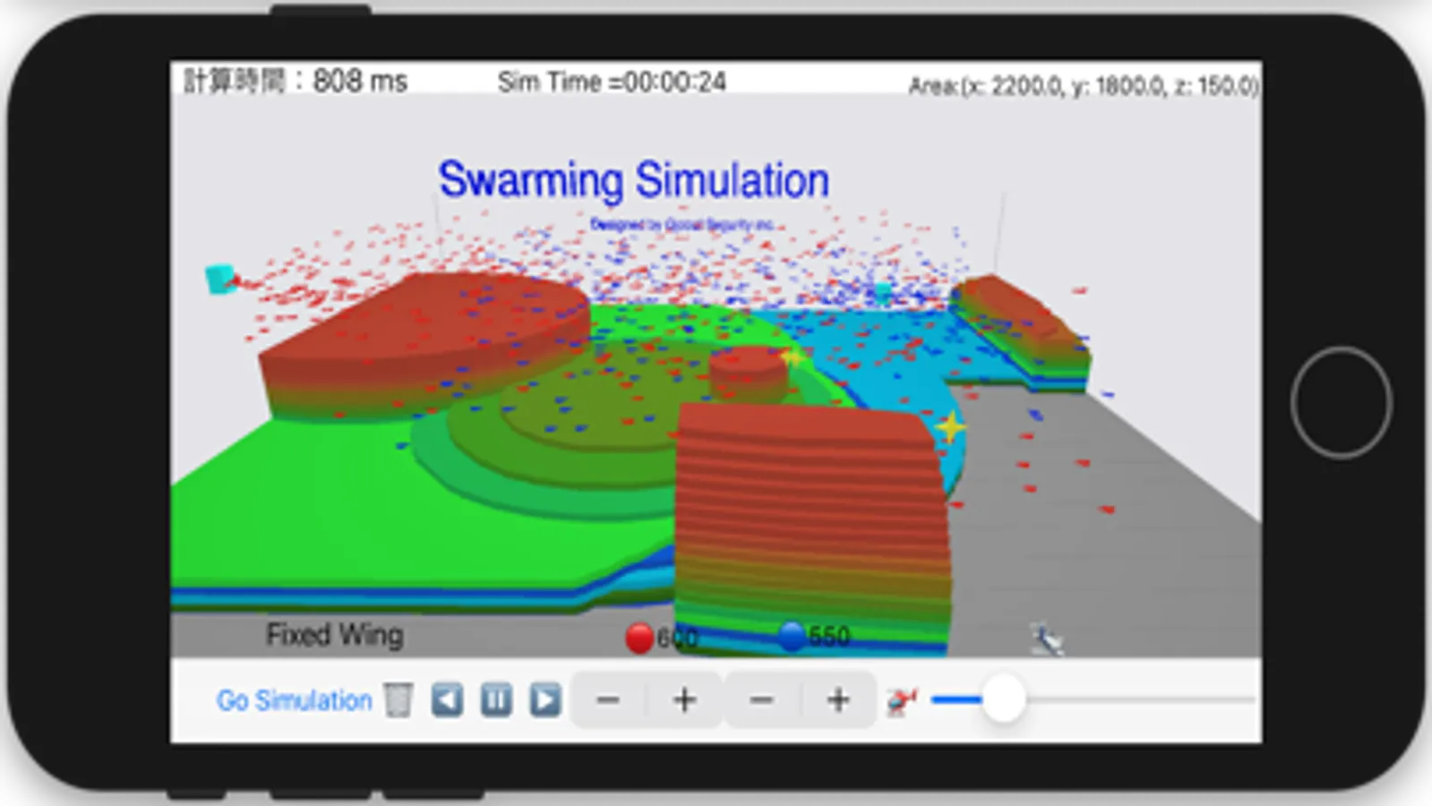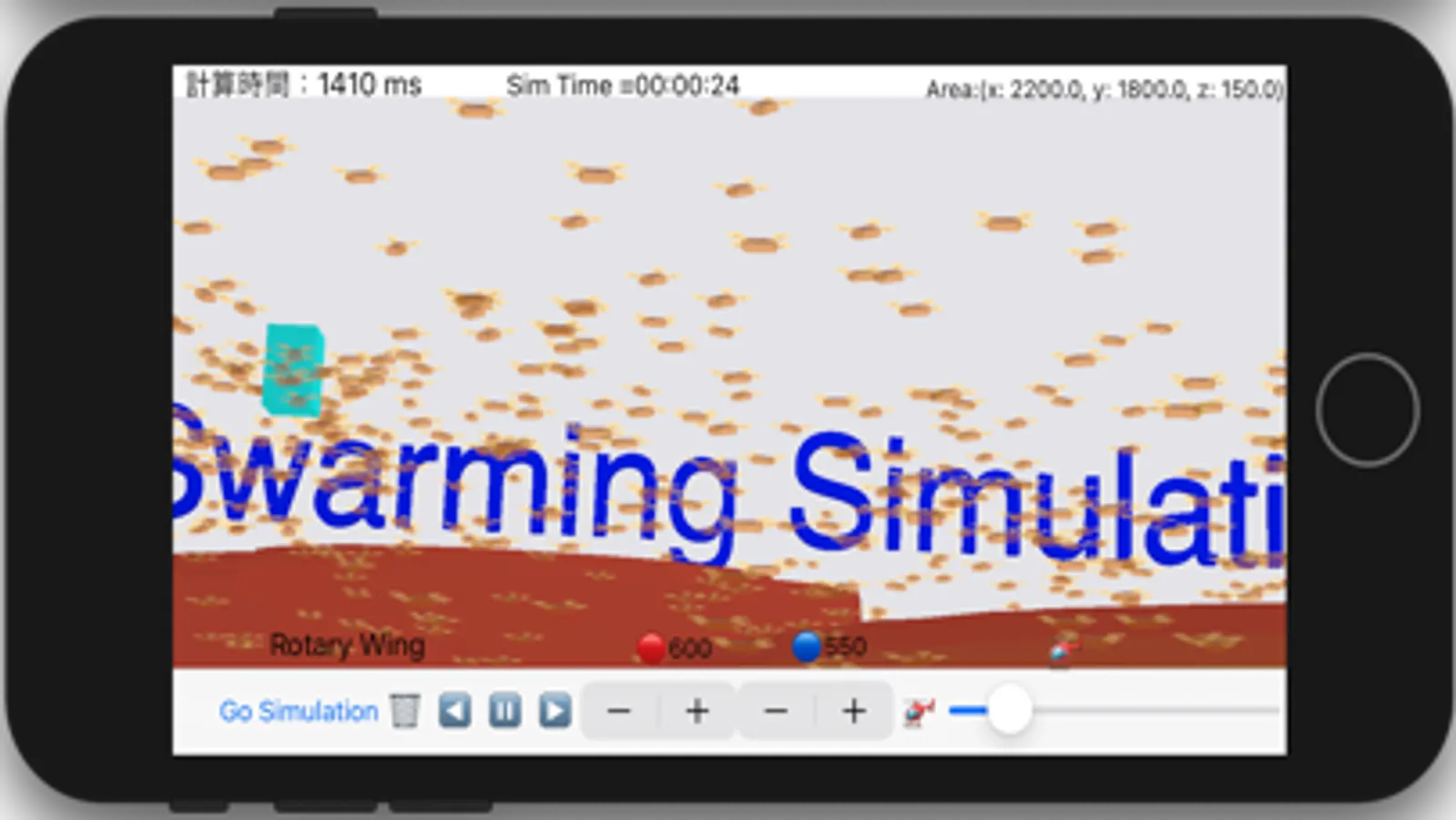 多数のドローンの飛行を、同時にコントロールする(群制御)のシミュレータです。現在世界各国でこの群制御技術が注目されています。このiPhoneやiPadでのシミュレーション速度は、高価な計算機をも凌駕する性能を有しています。