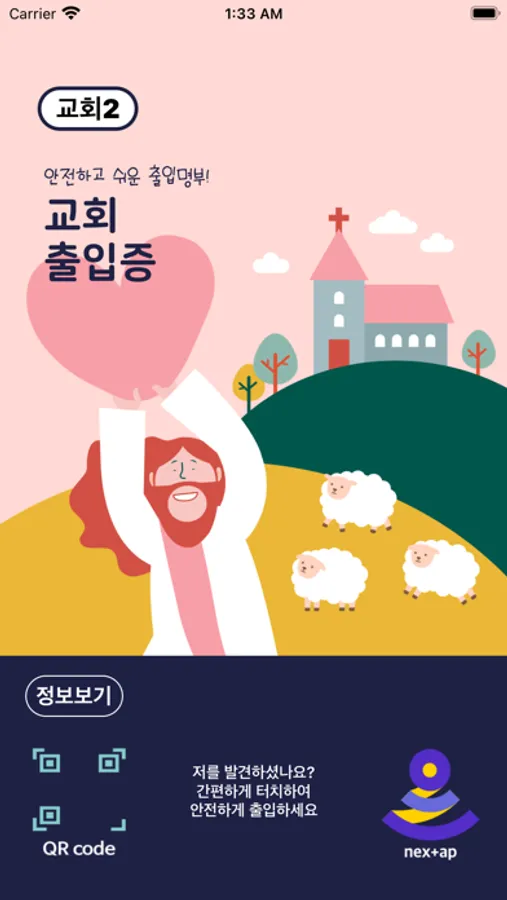 앱을 켜고 교회에 설치된 출입 Tag에 핸드폰을 가볍게 터치하면 출입 완료! NFC가 어려우시거나 지원되지 않는 핸드폰 기종을 위해 QR을 같이 제공합니다.