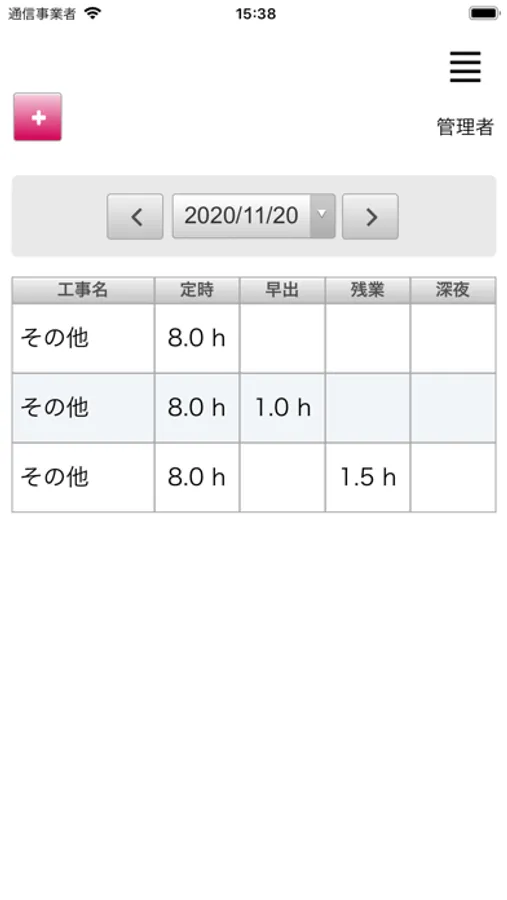 作成済み日報の一覧です。案件名と作業時間が表示されます。