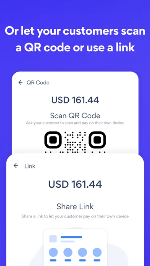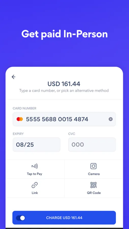 Process in-person contactless payments with Tap to Pay with iPhone, scanning a QR code, or sharing a link, to let your customers checkout with Apple Pay, Google Pay, or with contactless credit and debit cards! Alternatively use your keyboard, or securely scan card details with your camera