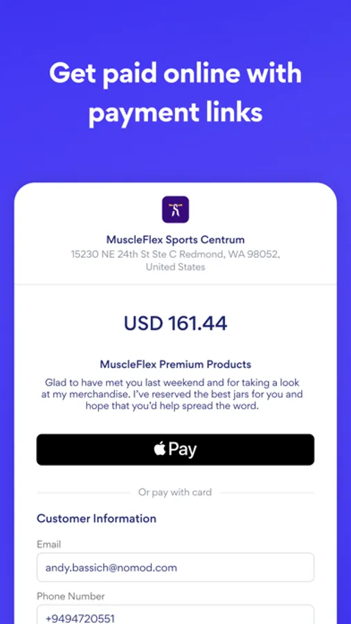 - Send Receipts & Capture Notes: Add notes to your in-person payments and links for easy recall. Send out beautiful email receipts with a single tap to give your customers full transaction history, the information they're after, and peace of mind