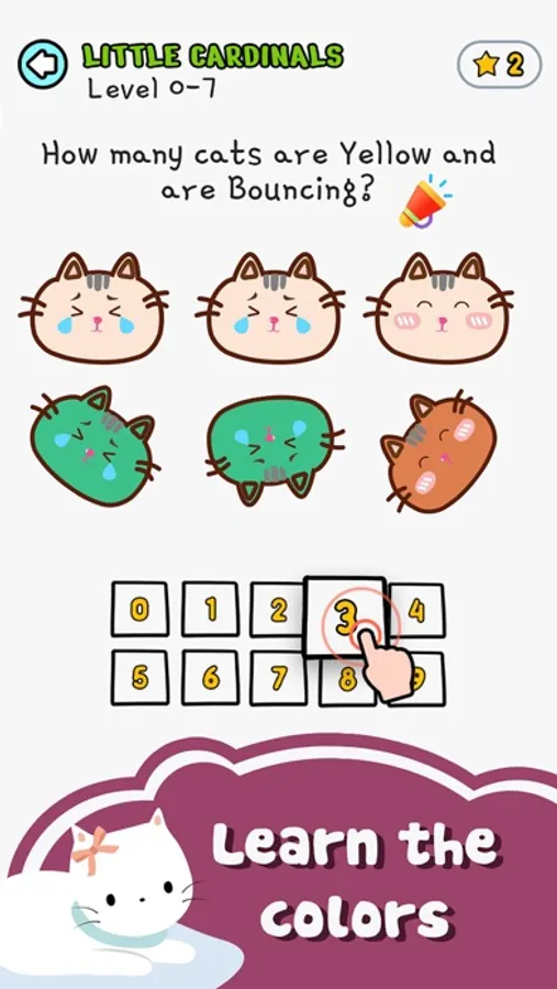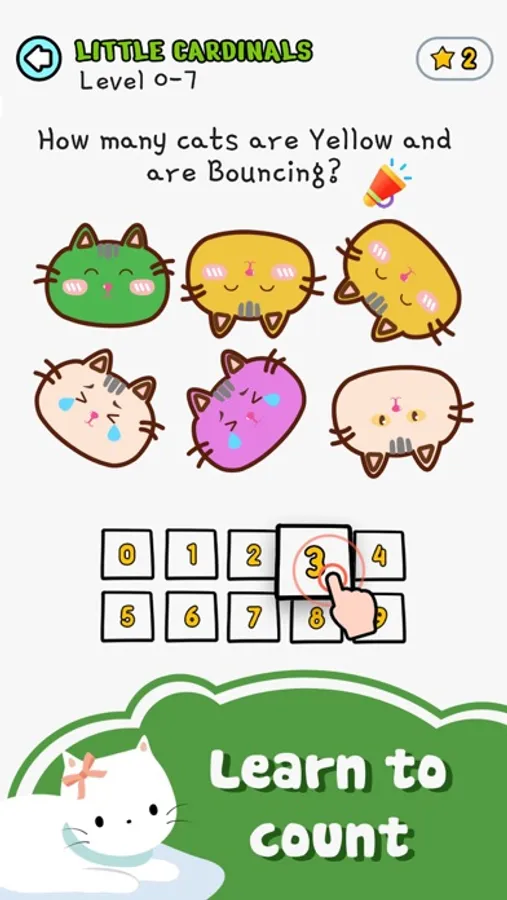 • The game app involves 32 sets of multiple choice questions in order of difficulty. Simple ones include counting, cardinals, distraction, subset, addition, etc. while difficult ones consist of subtraction sub, triple intersection, disjunction and so on (some are challenging to adults too).