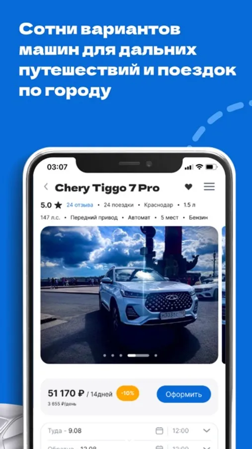 Найдите автомобиль поблизости на карте или закажите доставку к своему дому или в аэропорт. Перед бронированием посмотрите настоящие фотографии автомобиля, изучите отзывы от других водителей и оплатите поездку банковской картой, заключив договор онлайн в мобильном приложении.