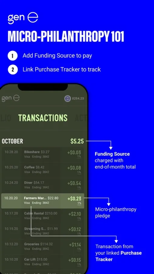 Download the app, create your Gen E account, and complete two quick steps to activate your purchase-driven micro-philanthropy: