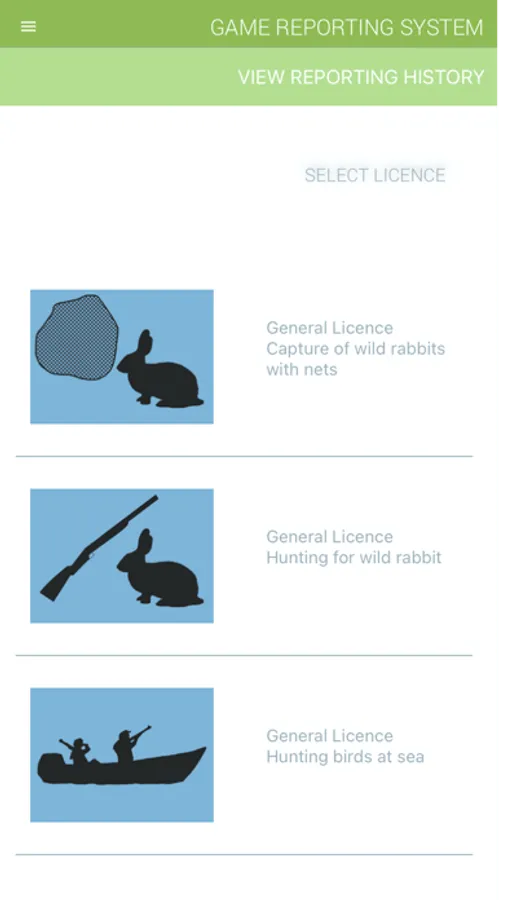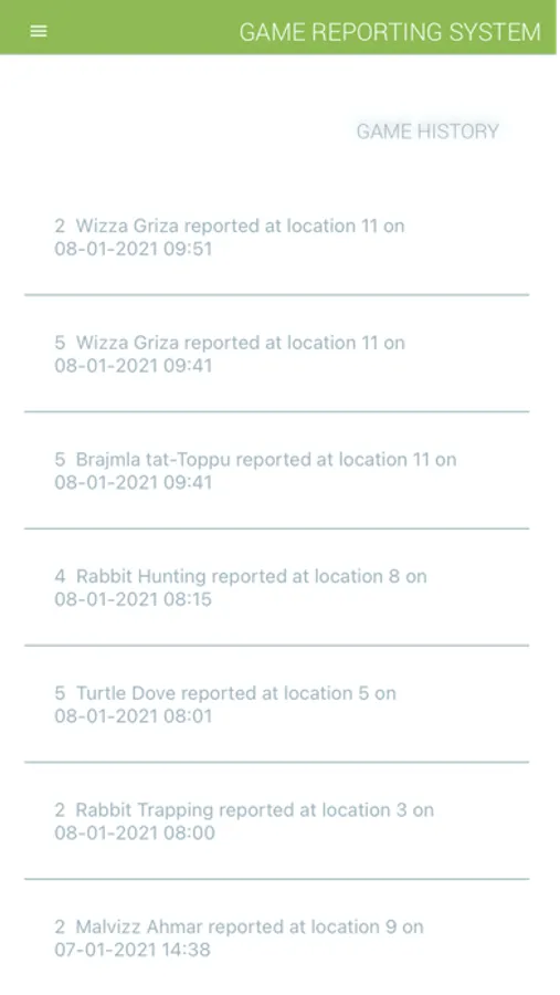 Game Reporting MT hi mezz kif persuna, b’ liċenzja maħruga mit-Taqsima tar- Regolamentazzjoni tal-Għasafar Selvaġġi, tista’ tirraporta qbid ta’ għasafar u fniek. Din l-app tista’ tintuża minflok is-sistema tar-rappurtar telefonika permezz ta’ stampi b’mod iżjed faċli.