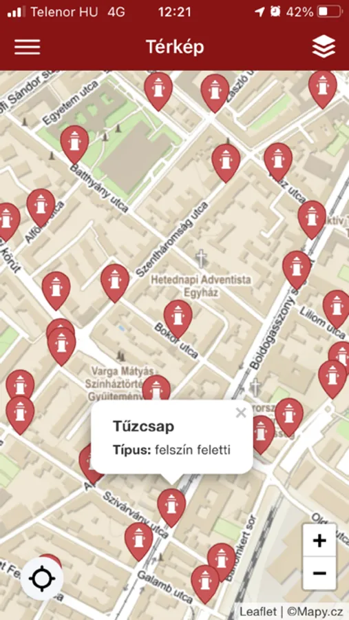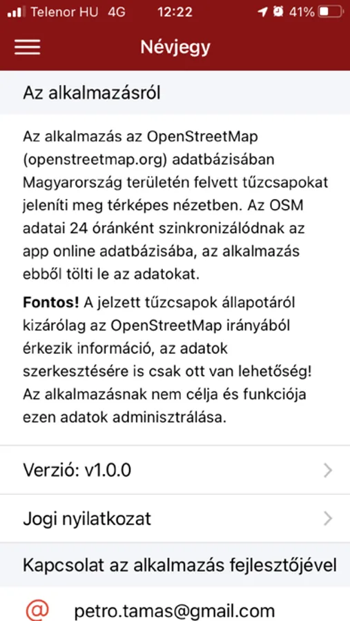 A jelzett tűzcsapok állapotáról kizárólag az OpenStreetMap irányából érkezik információ, az adatok szerkesztésére is csak ott van lehetőség! Az alkalmazásnak nem célja és funkciója ezen adatok adminisztrálása.