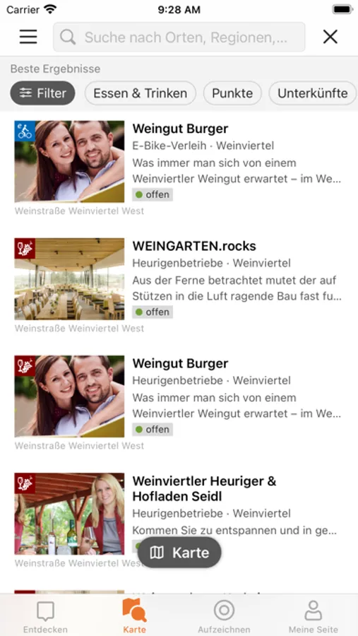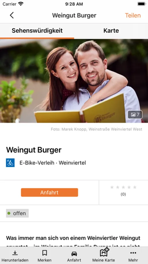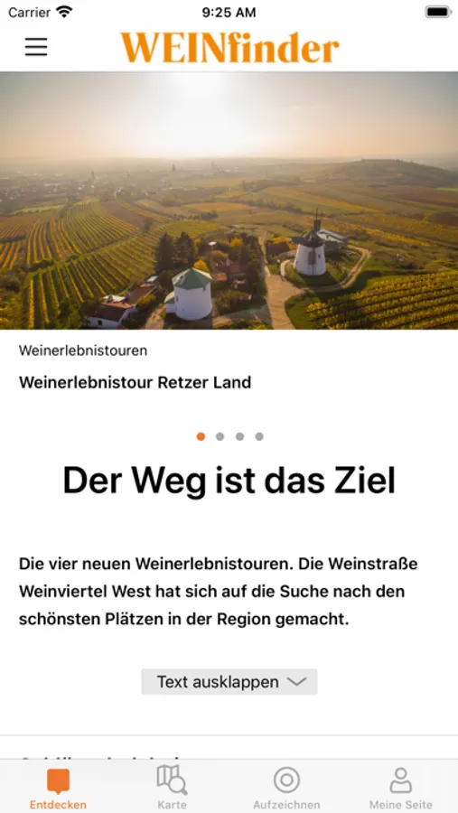 Entdecken Sie mit der WEINfinder App die Weinstraße Weinviertel West und erkunden Sie die vier spannenden Weinerlebnistouren. Es erwarten Sie sehenswerte Punkte wie die Schlüsselerlebnisse (überdimensional große Schlüssellöcher mit Durchblick), Fotopunkte in ruhiger und idyllischer Lage und echte Geheimtipps des westlichen Weinviertels. Mithilfe der App können auch Einkehrmöglichkeiten, Shoppingerlebnisse oder Unterkünfte in der Region ausfindig gemacht werden. Der Veranstaltungskalender bietet einen Überblick über alle Aussteckzeiten (Öffnungszeiten von Heurigen), kulinarischen Veranstaltungen und Weinfeste im westlichen Weinviertel.