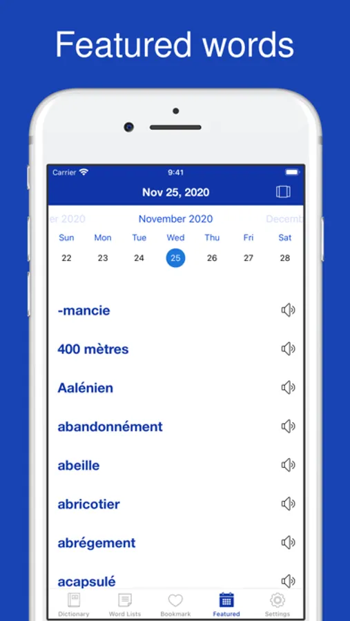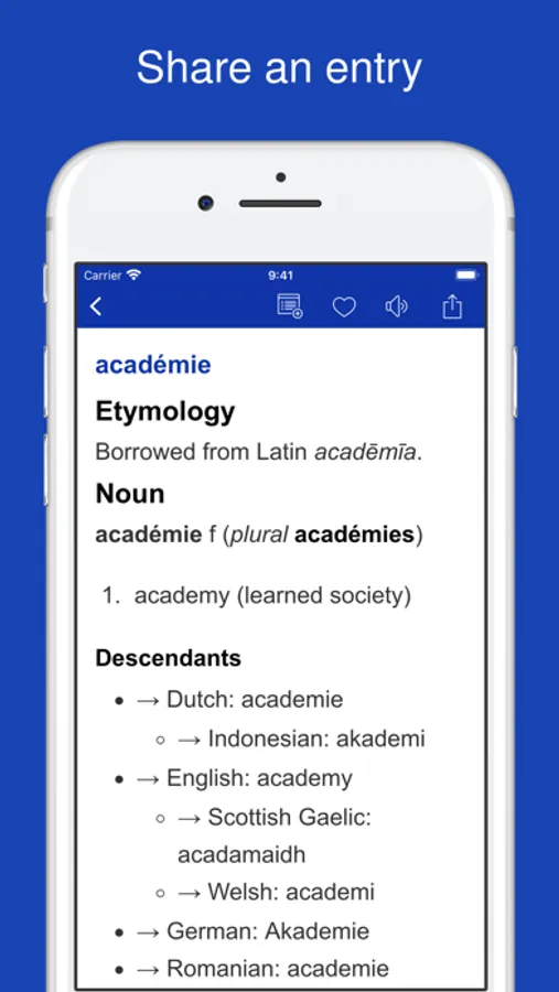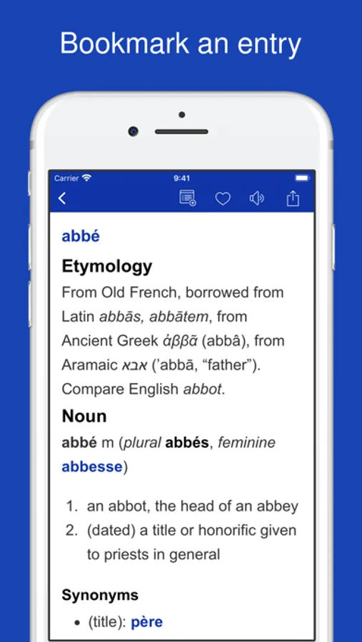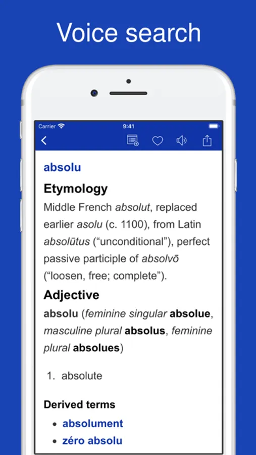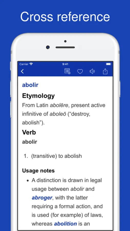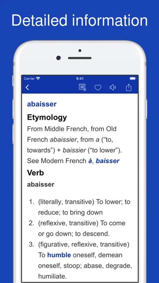 French words are listed with detailed meaning. Entries are cross-referenced to other entries.