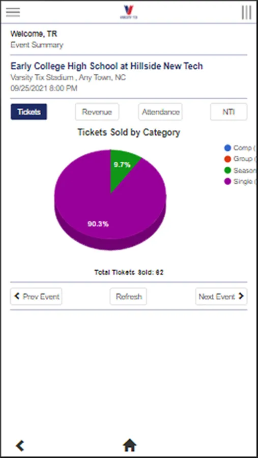 VT Reports provides a simple way to view a variety of real-time reports. Simply login in with your Varsity Tix credentials to access daily sales, event summaries, ticket usage reports and more. The easy to view graphs and charts show you instantly how an event is performing.