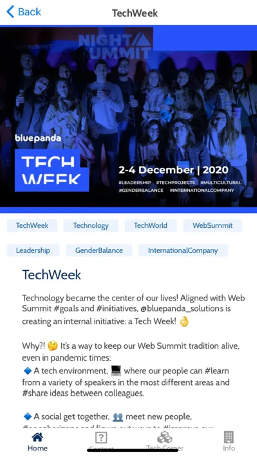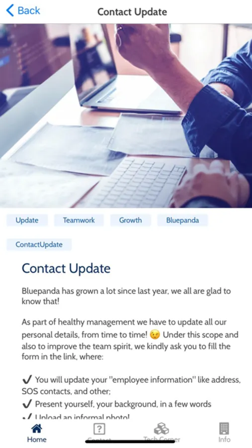 BluePanda App is a communication channel for companies. Here you can share company news, company information, ask your employees to answer surveys, notify when you have something important to share, register time, vacation days, make suggestions…all in their phone.