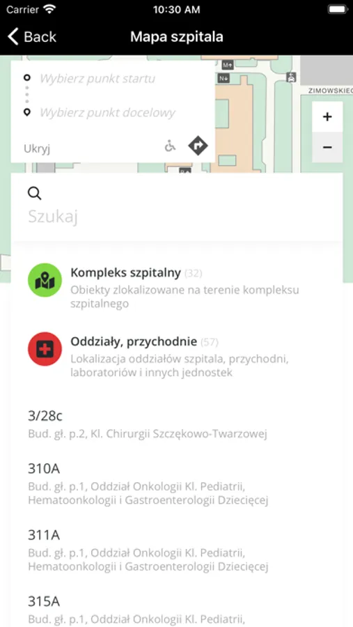 Dzięki aplikacji możliwe jest wyznaczenie trasy dojścia między oddziałami szpitala, wyszukanie pomieszczeń, sal chorych, wejść i innych obiektów na terenie szpitala.