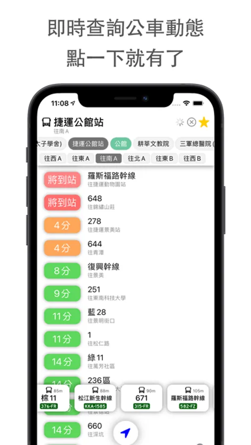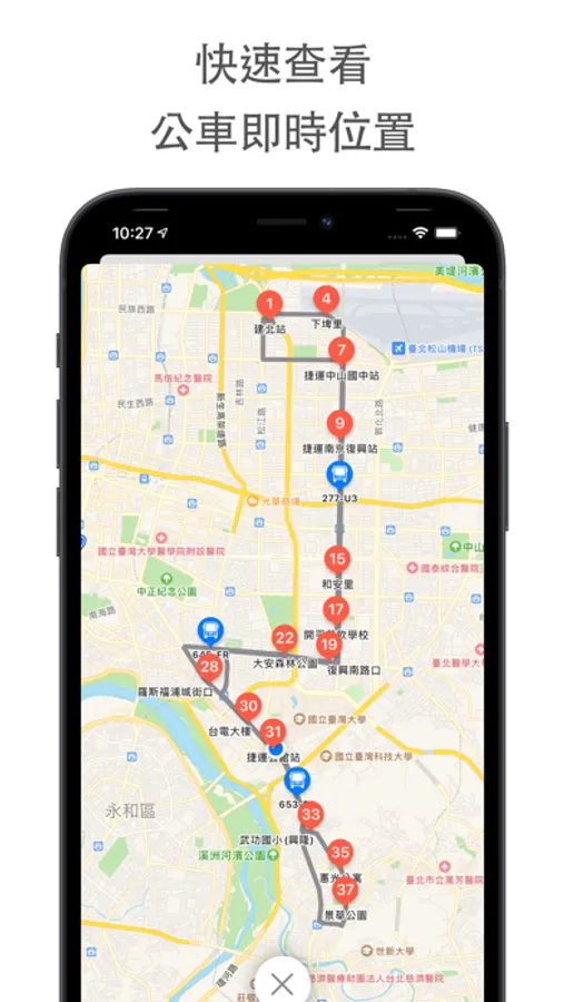 + 直接顯示離你最近的公車站及捷運站之即時到站資訊