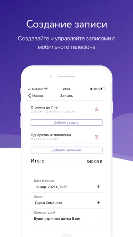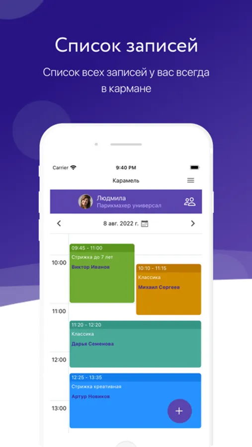 Так же приложение подходит для самозанятых мастеров и позволяет управлять записями с телефона не прибегая к использованию Web интерфейса.